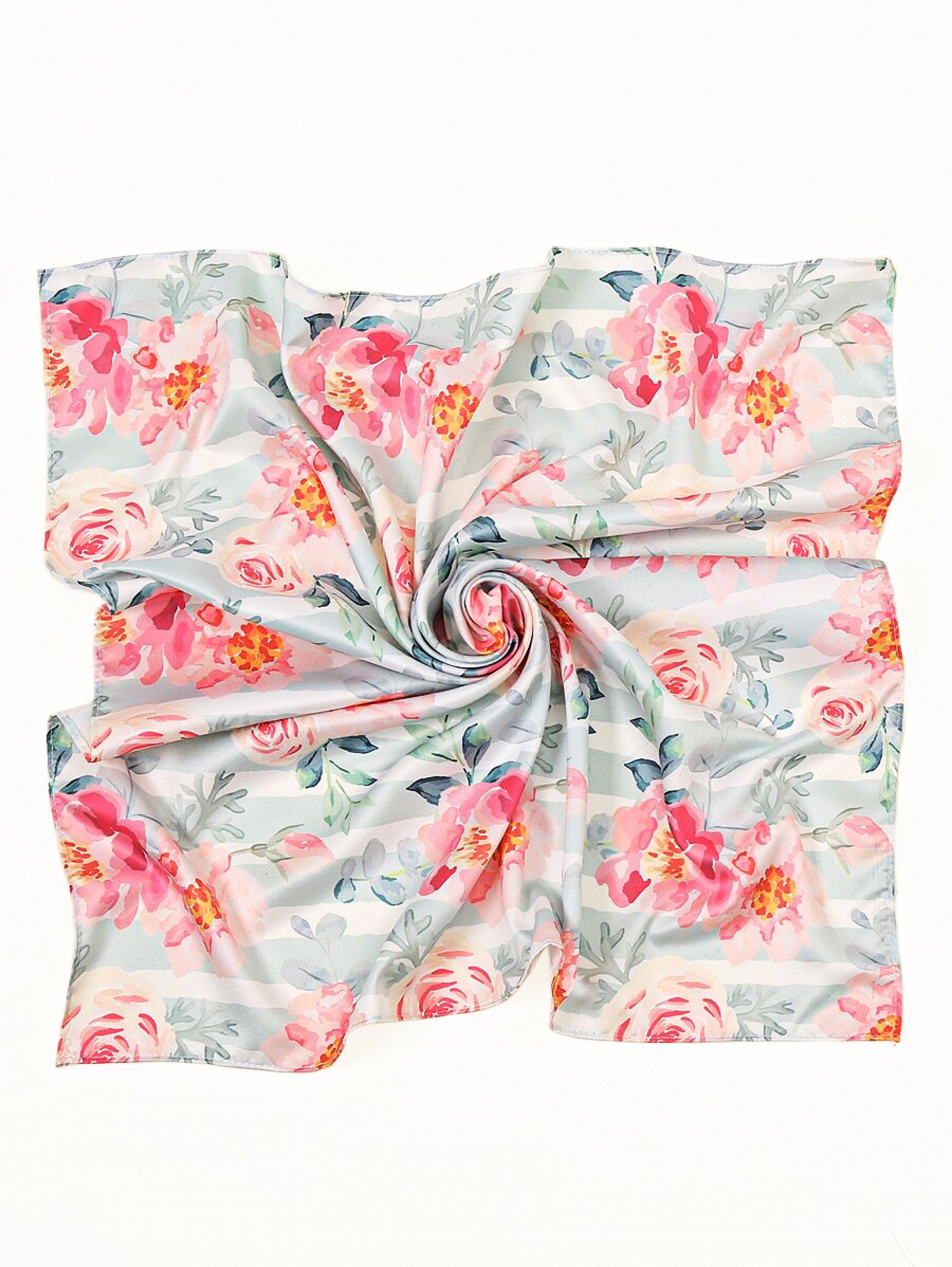 Soft, romantic, and beautifully feminine — this Square Satin Scarf features elegant pink rose flowers set against a stylish striped background in white and pastel mint green. A chic blend of classic floral beauty and fresh modern colour.