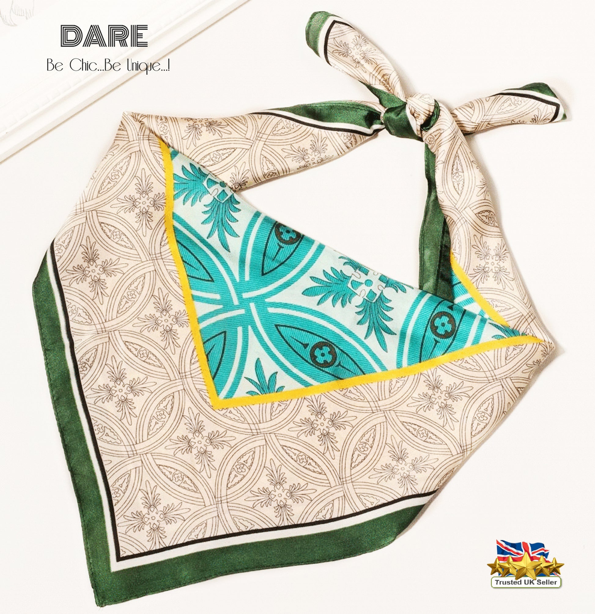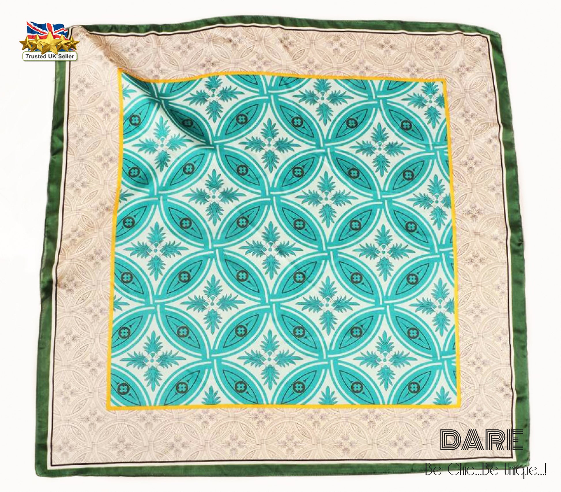 Add a bold, artistic touch to your everyday style with this stunning Square Scarf featuring a vintage geometric pattern. Designed in warm teal andturquoise tones, this piece blends retro charm with modern elegance. The unique geometric border in beige, cream, and green gives the scarf extra depth and character, making it a statement accessory for any outfit.
