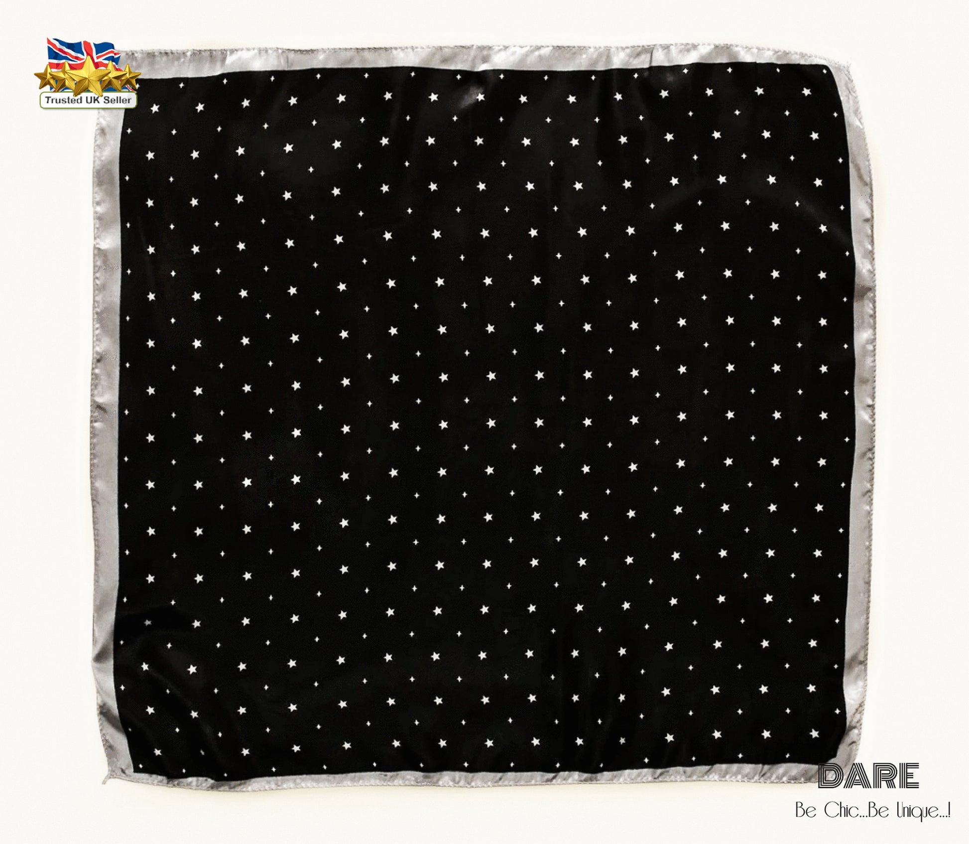 Add a cosmic twist to your wardrobe with our Black Stars Scarf, a dazzling blend of classic elegance and playful charm. Featuring a scattered silver star and polka dot print on a deep black background, this scarf is the perfect accessory for anyone who loves timeless patterns with a celestial edge.